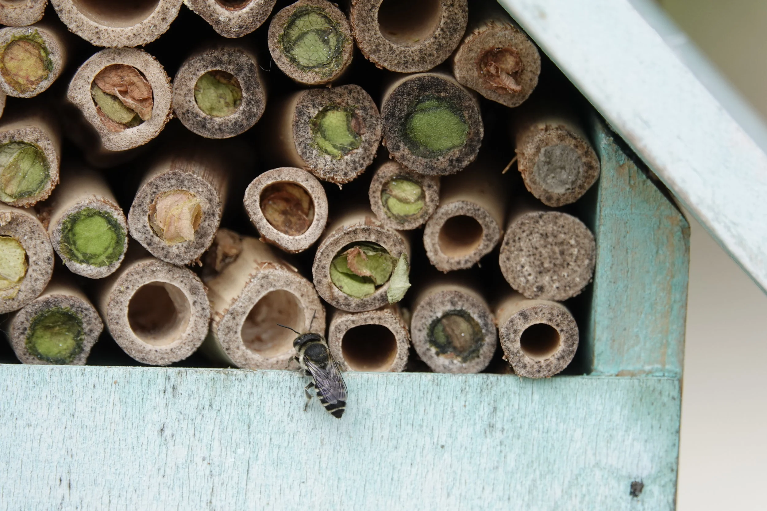 A native, solitary bee will fill an entire tunnel of this nest box with eggs and plug the tunnel entrance with mud, leaf pieces, or other vegetation. A bee hotel like this is a swell gift for a gardener.