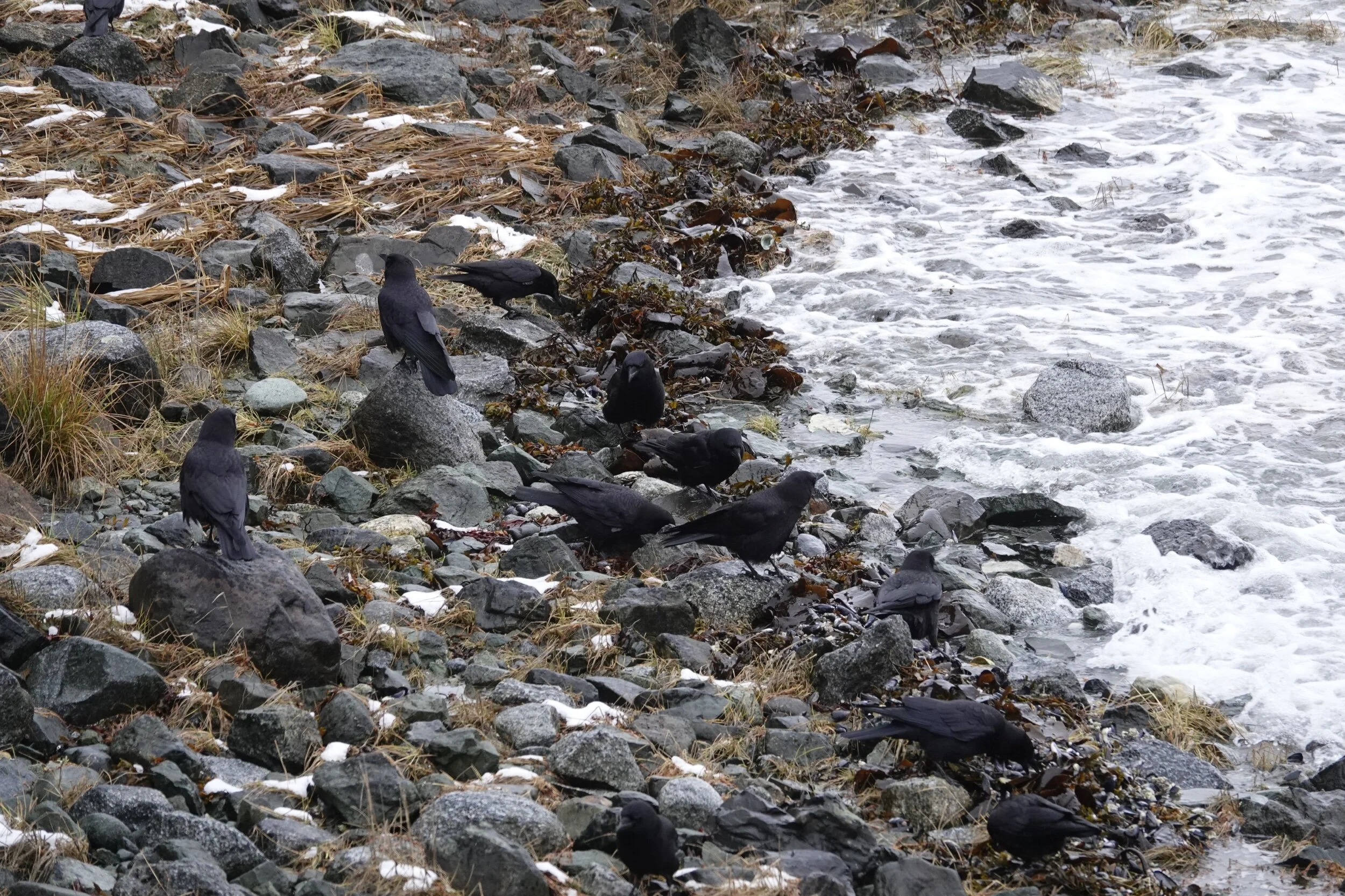 After posting a couple of sentries, the crows get busy with their foraging.