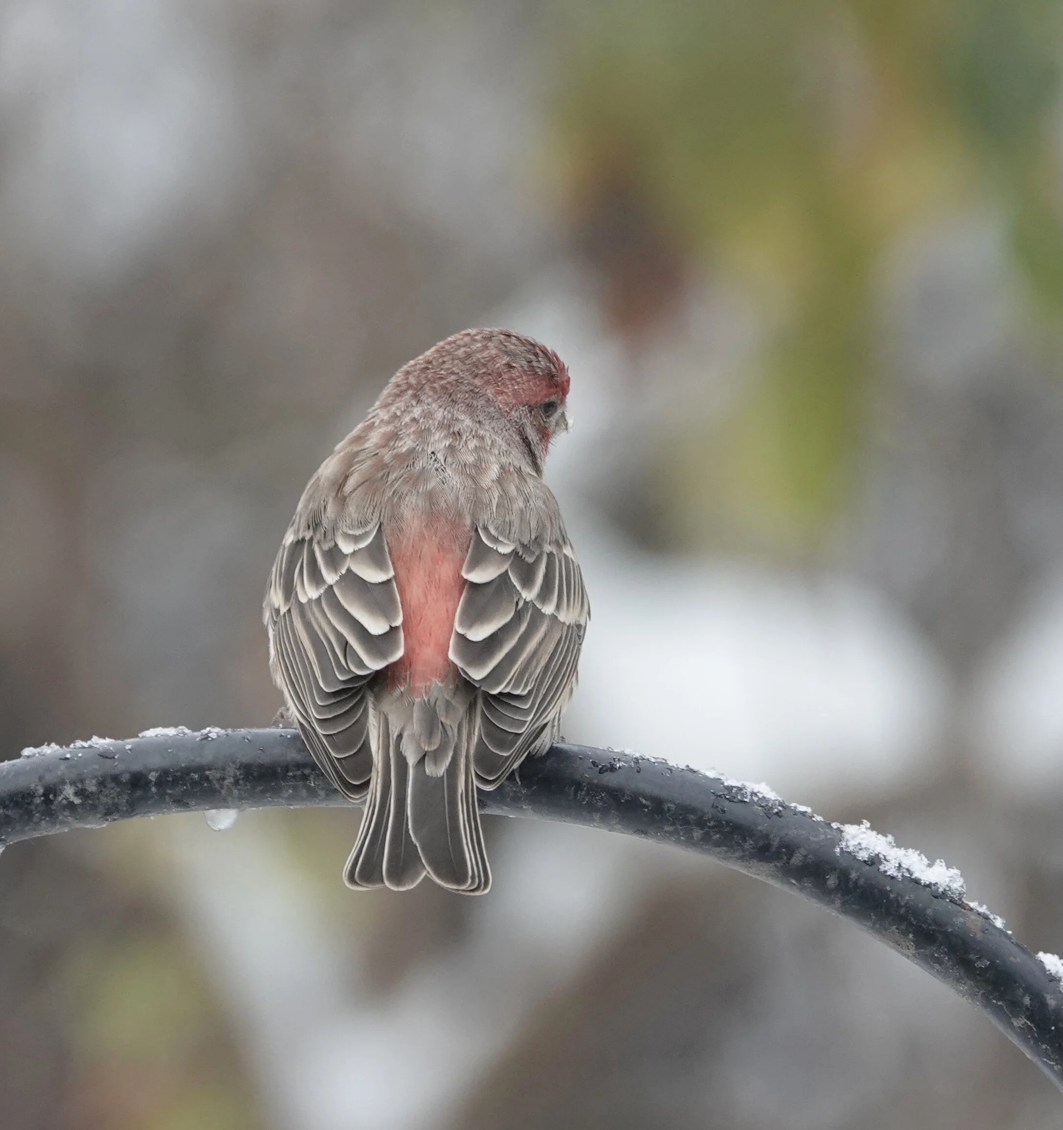 No matter which way you look at it, the House Finch male brings a bit of color to a snowy landscape.