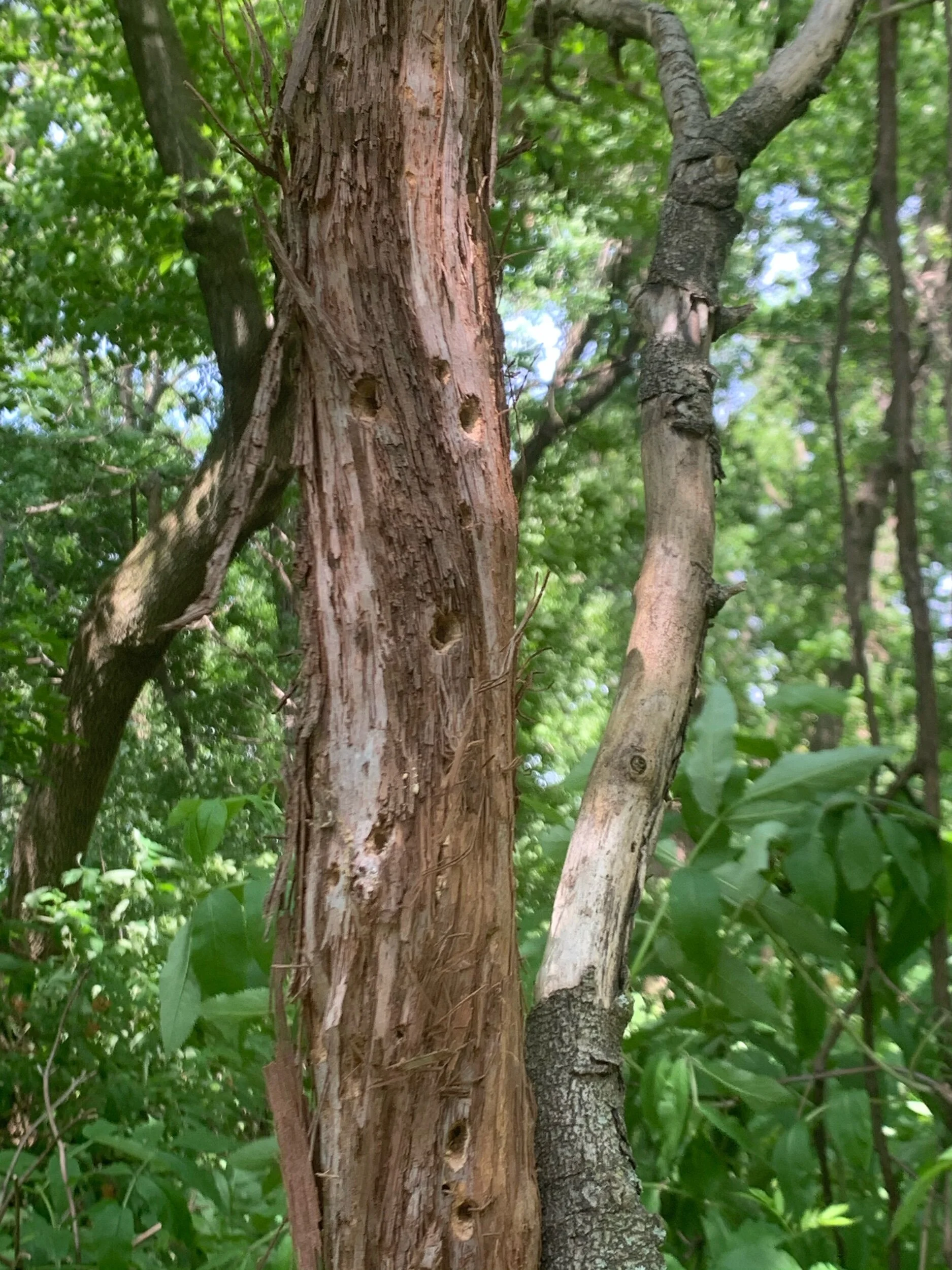 Woodpeckers have been working on a huge and dead grapevine. Such vines were the Tarzan vines of my dear boyhood.