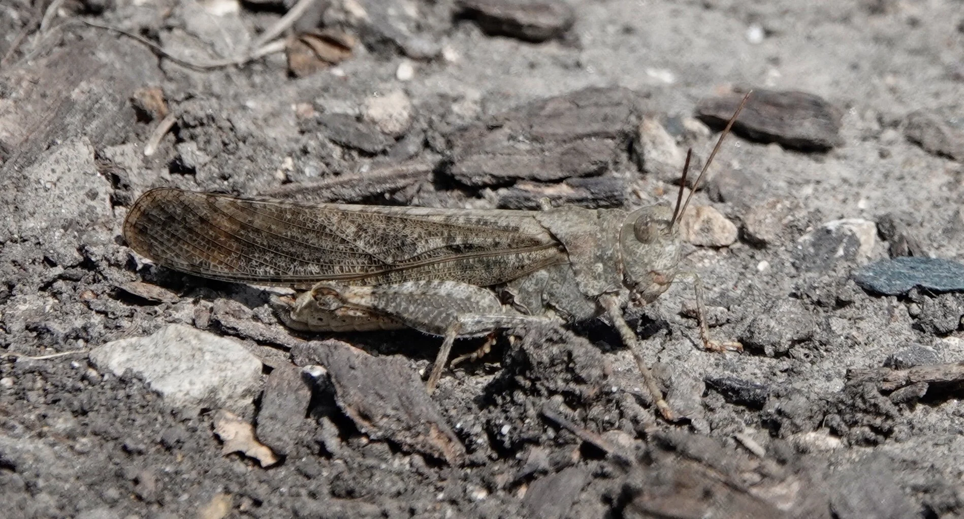 A Carolina Locust trying to look like dirt and succeeding. It makes crackling sounds called crepitations in flight.