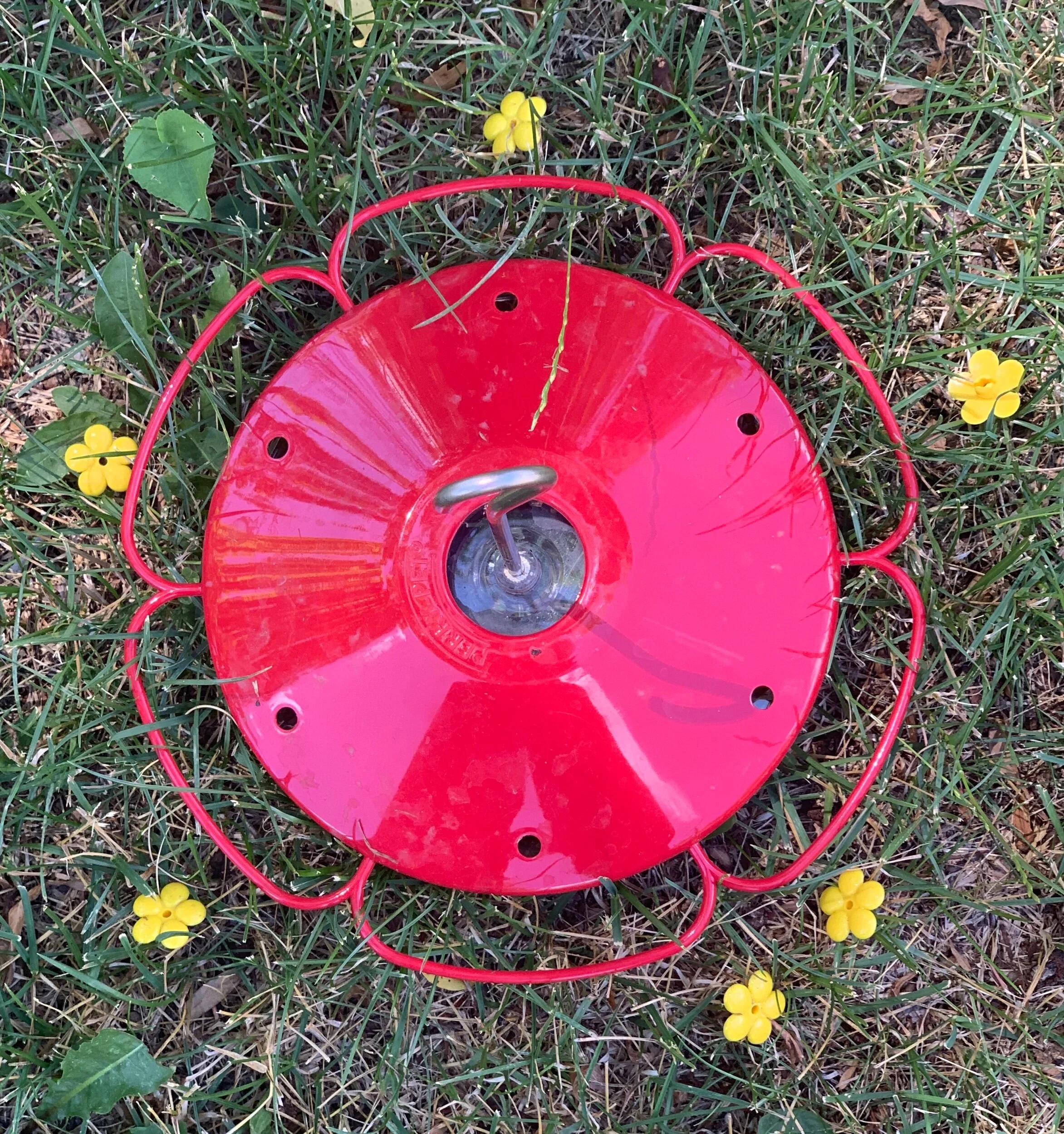 I was late getting home and didn’t get the hummingbird feeder down before a raccoon had the opportunity to take it down for me. The raccoon had removed all six of the yellow flowers from their cavities and slurped down all the sweet water.