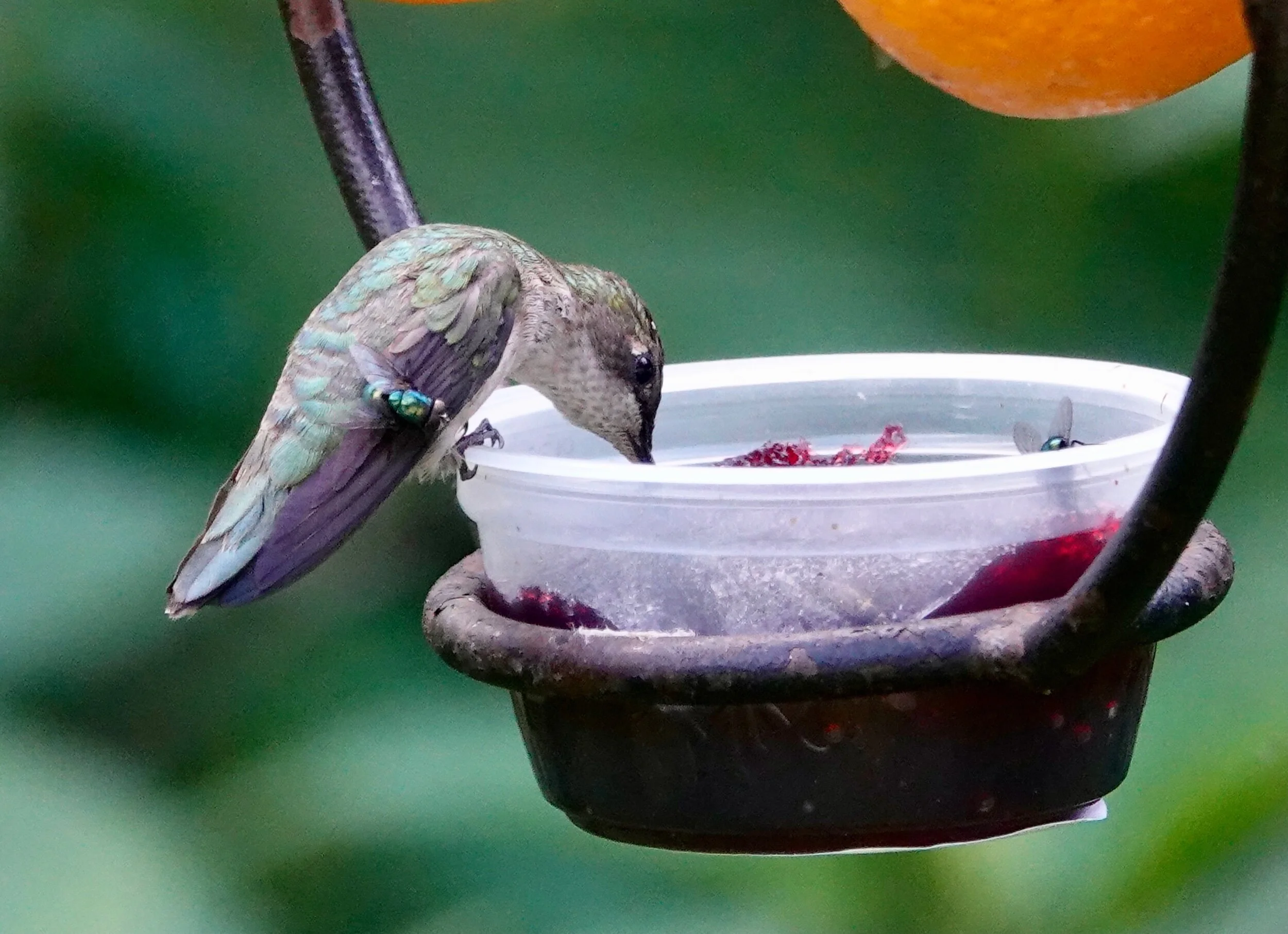 A large fly on a small bird. This hummingbird was drinking grape jelly juice.