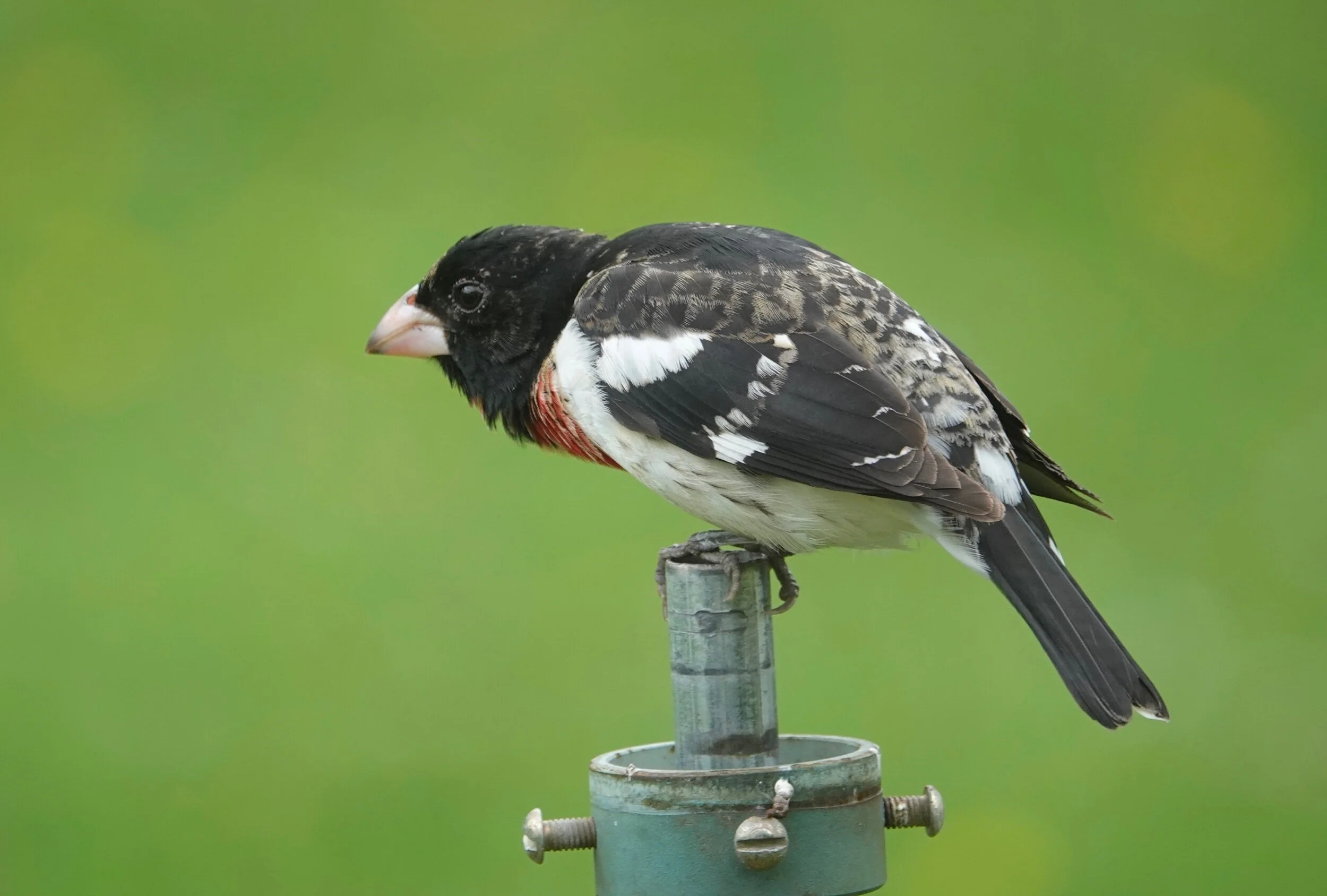 This Rose-breasted Grosbeak was wondering where the old feeder had gone. It had fallen victim to a fallen limb.