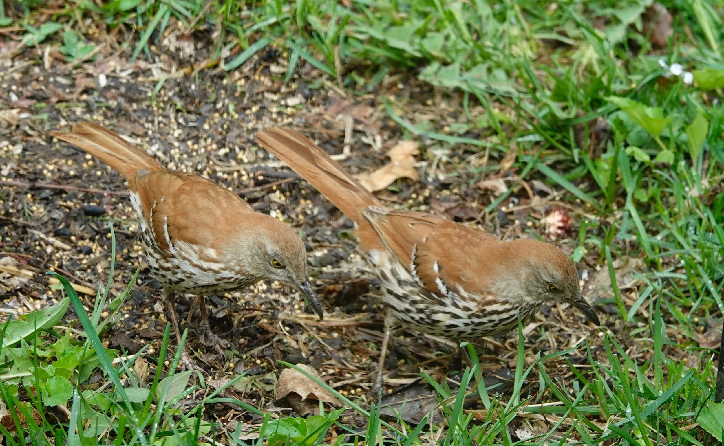 A pair of Brown Thrashers involved in a team-building exercise.