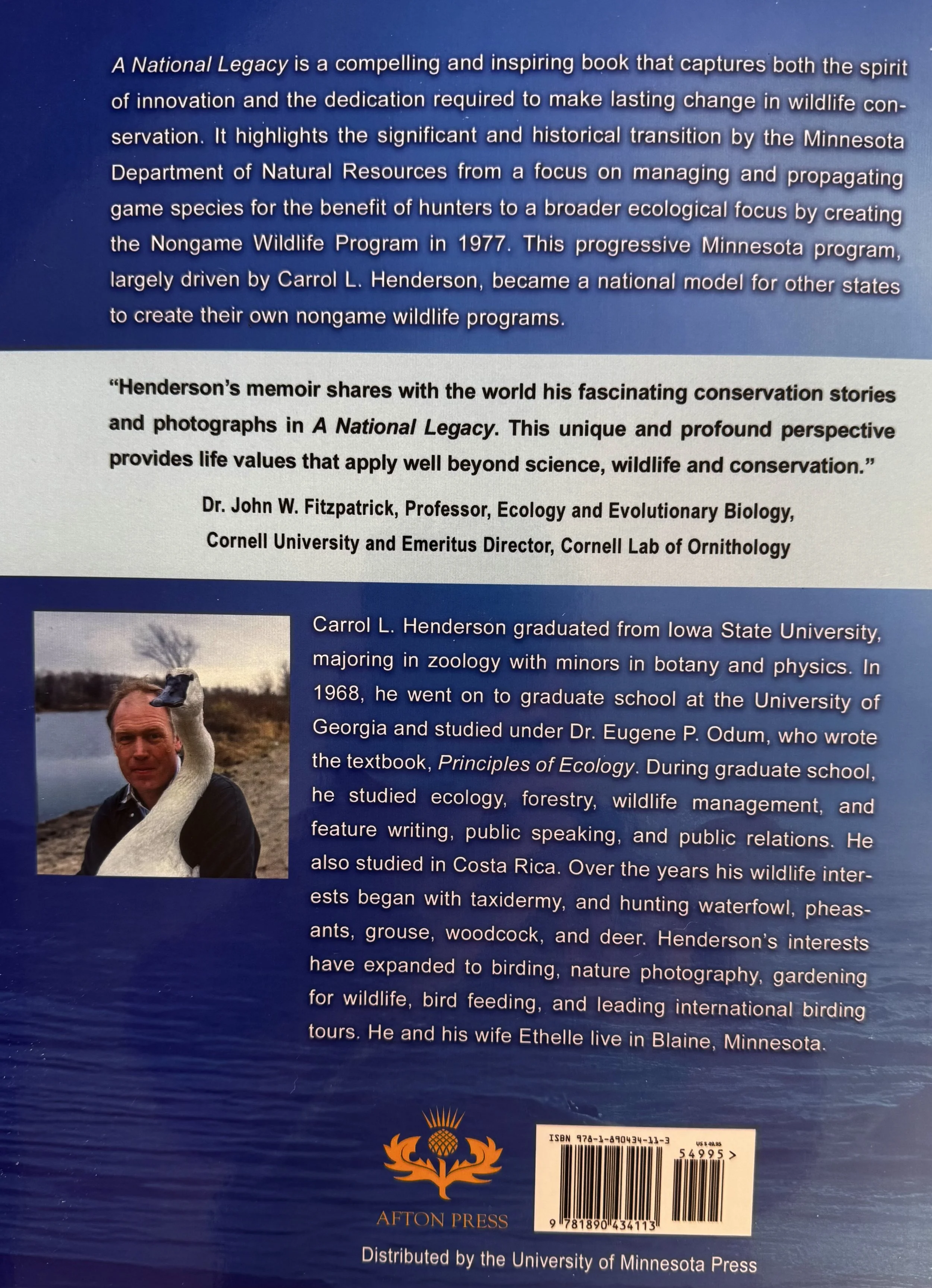 I enjoyed a publication titled “A National Legacy: Fifty Years of Nongame Wildlife Conservation in Minnesota,” an excellent book filled with touching stories and inspiring accounts written by a remarkable man, who is one of my heroes. For over 40 years, Carrol was the director of the Nongame Wildlife Program for the Minnesota DNR. He has authored a number of books and has been honored with awards from the Nature Conservancy, the U.S. Fish and Wildlife Service, the Minnesota Ornithologists’ Union, and The Garden Club of America.