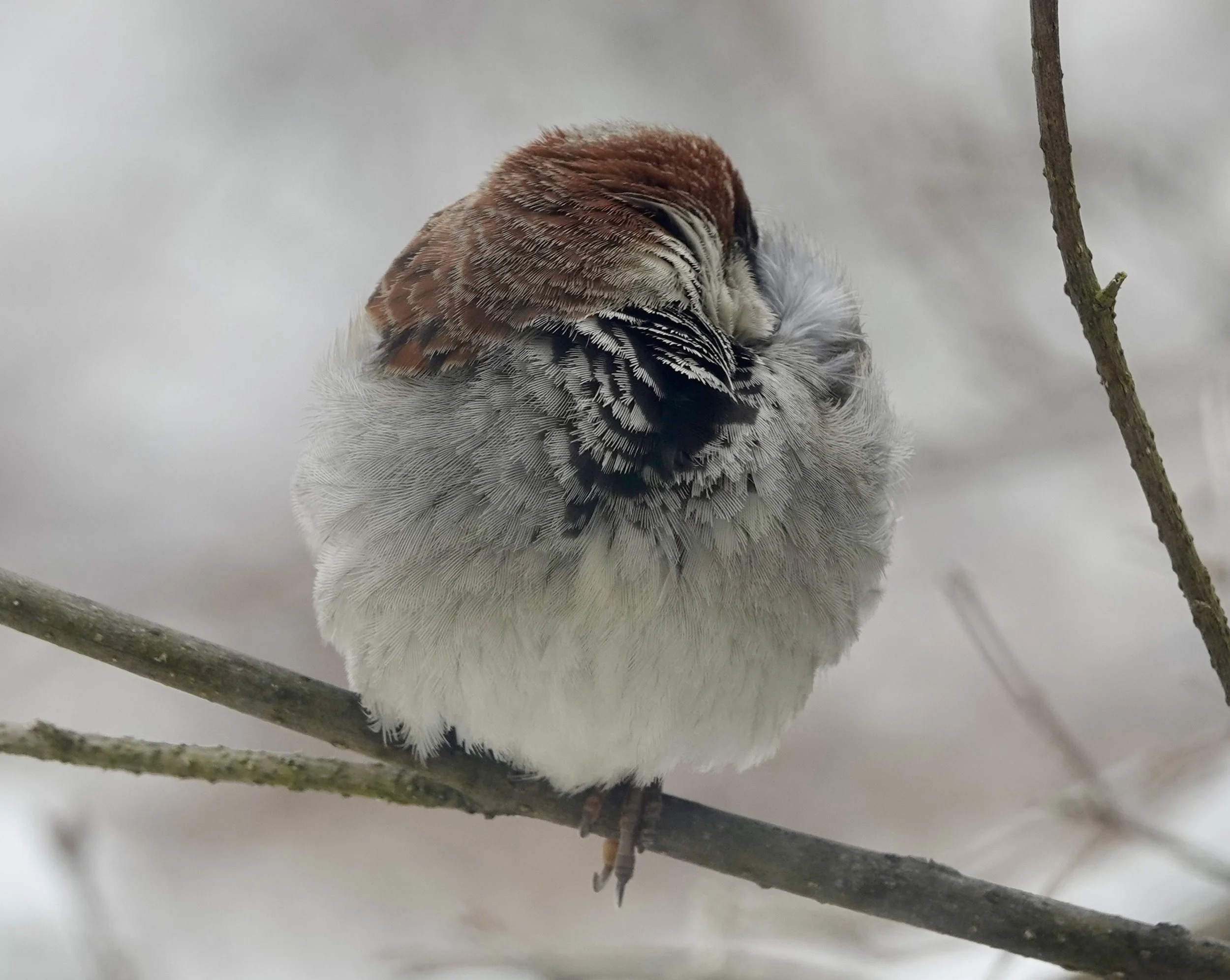 What do you do if you left home without your puffy jacket, even though your mother told you to never leave home without your puffy jacket? What do you do? If you are a bird, like this house sparrow, you fluff your feathers to trap air close to your body. This acts as insulation. And you poke your beak under shoulder feathers to keep it warm on a beak-chilling day. Photo by Al Batt.