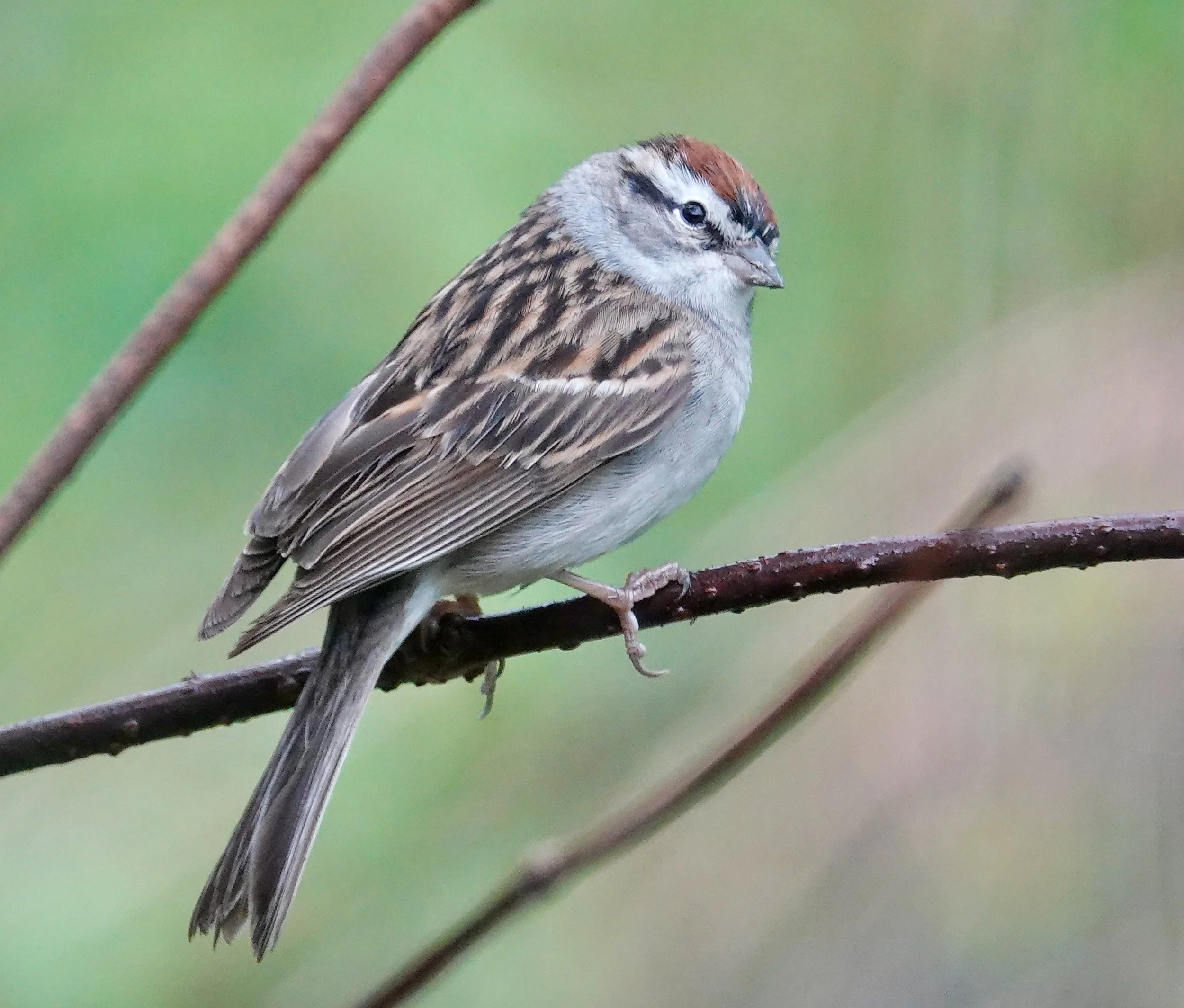 The American tree sparrow (winter) and chipping sparrow (summer) are similar small birds with rusty caps. The tree sparrow has a central breast spot (sometimes hidden), bicolored yellow/black bill, dark legs, and rusty eyeline. A chipping sparrow has an unspotted breast, black bill, light-colored legs, and black eyeline. Edward Forbush nicknamed the chippy the "little brown-capped pensioner" because it foraged for crumbs around farmhouses. Photo of a chipping sparrow by Al Batt.