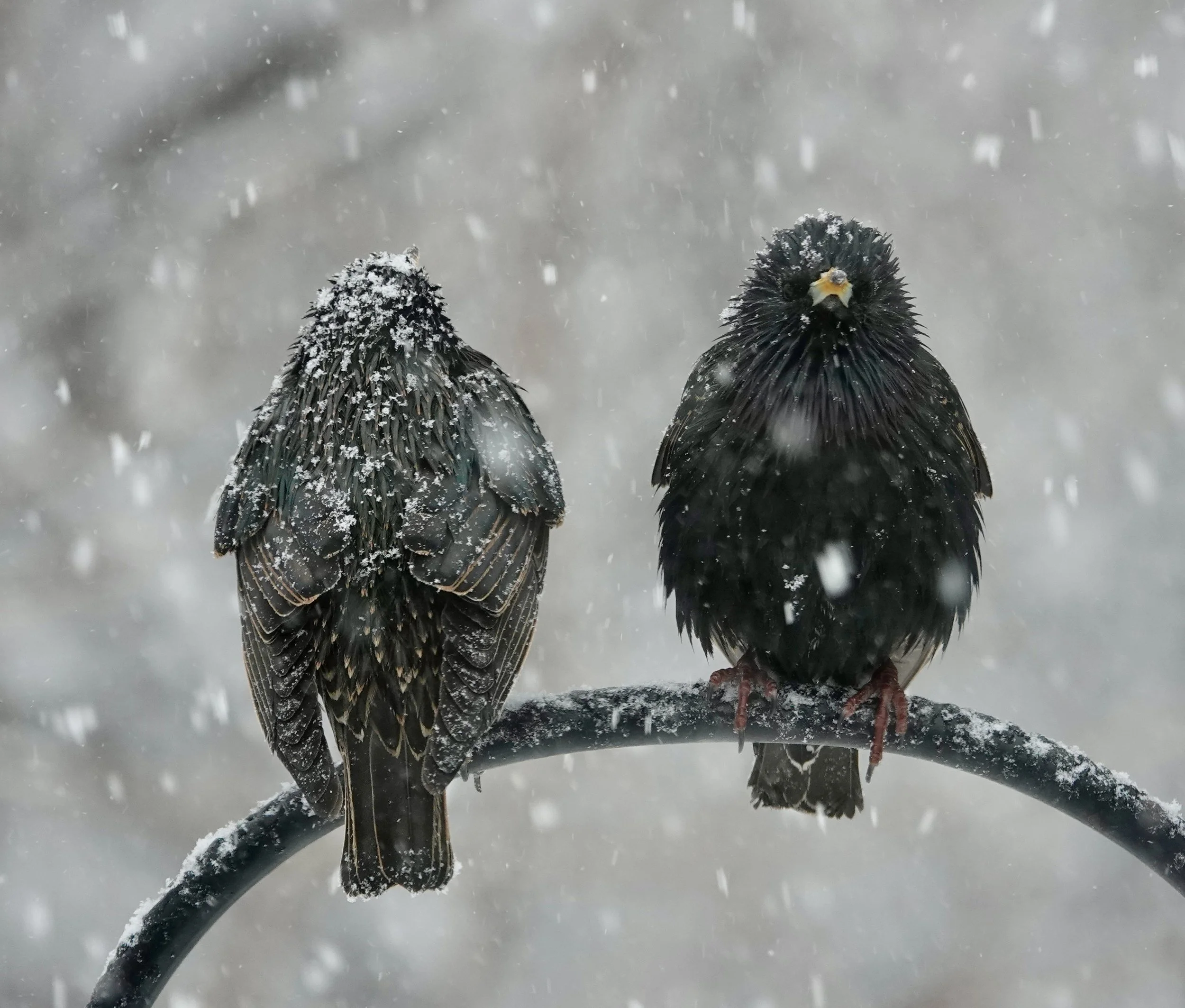 These European starlings with yellow bills appeared to be somewhat less than enamored with the blizzard. Photo by Al Batt.